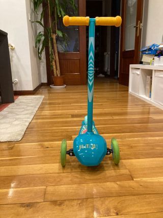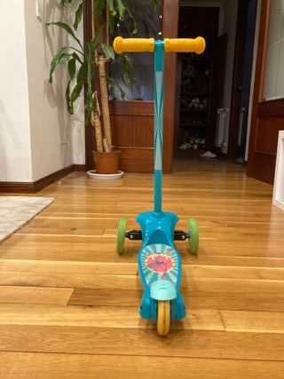 Patinete de tres ruedas en color azul, ideal para niños. - Diseño llamativo con detalles gráficos. - Ruedas de color verde. - Manillar con puños naranjas.