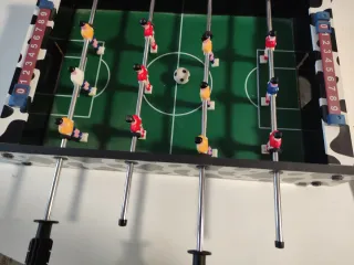 Futbolín de mesa compacto, perfecto para llevar la diversión a cualquier lugar. Su diseño es llamativo con detalles de vaca. - Campo de juego verde con líneas blancas. - Jugadores de diferentes colores. - Marcadores de puntuación a cada lado.