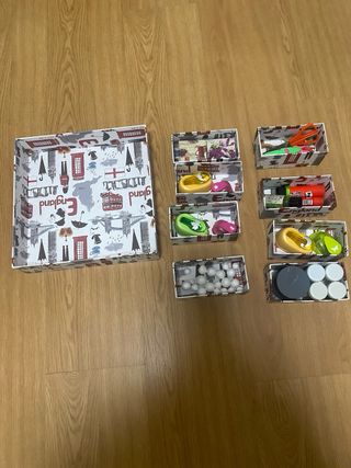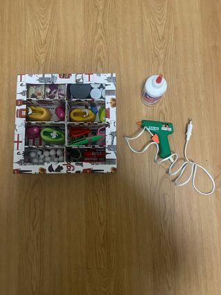 Caja para hacer manualidades con 8 compartimentos. Contiene: Cola Mini pistola de silicona con una barra aparte de silicona Dos pegamentos (uno grande y uno pequeño) Bote de purpurina 2 tijeras, una normal y otra para dar formas Pinzas y cinta de decoración 6 grapadoras para dar formas (3 grandes, 1 mediana y 2 pequeñas) Formas brillantes para decorar (caritas, feliz cumpleaños, estrellas, ….) 4 botes de estrellas pequeñas de diferentes colores Bolas de forespán Precio negociable 💰