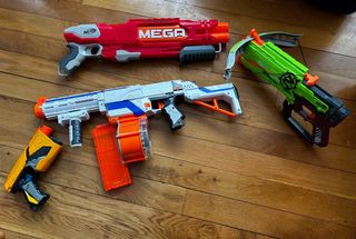 lote completo de lanzadores Nerf originales en perfecto estado de funcionamiento. El lote incluye: Nerf Elite Retaliator: El más versátil. Incluye culata desmontable, cañón frontal y agarre táctico. Tambor de 25 dardos: Accesorio de alta capacidad (difícil de conseguir por separado). Incluye también un cargador estándar de 6. Nerf Mega DoubleBreach: Escopeta de doble cañón para dardos grandes (incluye 6 dardos Mega originales). Nerf Zombie Strike Outbreaker Bow: Ballesta con tambor rotativo de 5 disparos. Extras: 2 gafas de protección Nerf originales para jugar con total seguridad
