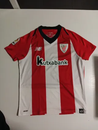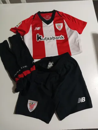 Conjunto deportivo del Athletic Club. - Camiseta de manga corta con cuello en V. - Pantalón corto. - Incluye dos pares de calcetines. - Diseño a rayas rojas y blancas en la camiseta. - Escudo del club en la camiseta y el pantalón.