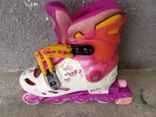 Patines para niños con un diseño divertido y colorido. Perfectos para iniciarse en el patinaje. - Color principal blanco con detalles en rosa y naranja. - Decoración de mariposas en el lateral. - Cierre de velcro y hebilla para un ajuste seguro. - Ruedas de color rosa. Y REGALO rodilleras ,coderas y muñequera..y casco todo por 25€ con un par 15€. . Sólo patines en linea .10€ talla 27 .29.