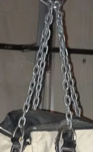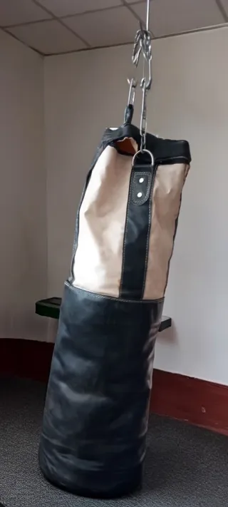 Saco de boxeo de alta calidad, ideal para entrenamiento. - Material resistente. - Diseño bicolor (beige y negro). - Cadenas de sujeción incluidas. Mide 900 de alto