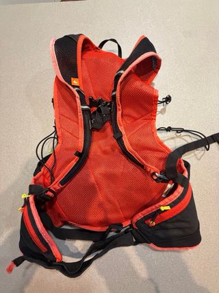 Mochila deportiva Quechua MT 20. - Color negro con detalles en blanco y coral. - Tirantes acolchados y ajustables. - Compartimento principal y bolsillos exteriores.