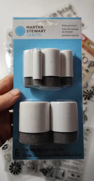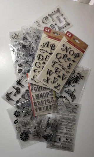 TODO A ESTRENAR - 13 sellos de silicona (5 con alfabetos y números) y otros con motivos de guirnaldas, esquineros, filigranas y volutas, letras, flores, mariposas, frases, etc. - 6 brochas de espuma Martha Stewart para manualidades.