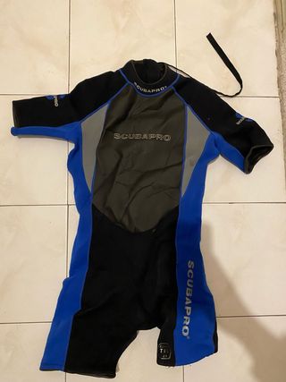Neopreno corto de la marca Scubapro, ideal para actividades acuáticas. - Material: 2.5mm de grosor. - Color: Azul y negro. - Talla: L. - Diseño corto para mayor libertad de movimiento.