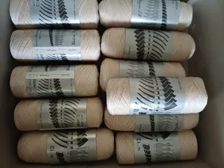 Lote de 11 ovillos de hilo Trifinca. - Color: Blanco. - Composición: 100% Algodón Egipcio. - Grosor: N. 12. - Peso: 100 gramos por ovillo. - Longitud: 950 metros por ovillo.