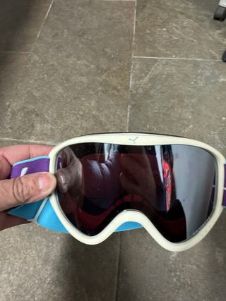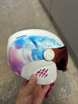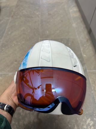 Casco de esquí con visor integrado, adecuado para niños y niñas. Diseñado para ofrecer protección y comodidad en la montaña. - Visor de espejo con tinte rojizo. - Diseño blanco con detalles azules. - Correa ajustable para un ajuste seguro. - Talla S