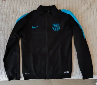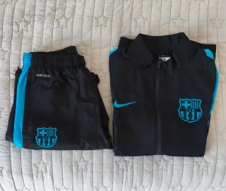 Conjunto de chándal del Fútbol Club Barcelona. - Chaqueta negra con detalles en azul. - Pantalón negro con detalles en azul. - Logo del FC Barcelona. - Tecnología Dri-Fit de Nike.