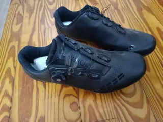 Zapatillas de ciclismo Tabolu con sistema de ajuste tipo BOA y calas incluidas. - Cierre BOA para un ajuste preciso. - Incluye calas para pedales automáticos. - Talla 45, yo uso un 44 de calle y me van perfectas. - Una tiene un pequeño roce en la puntera. Las vendo porque me apaño mejor con los pedales spd de montaña.