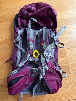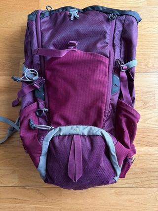 Mochila de alpinismo de la marca Decathlon, con una capacidad de 20+10 litros. Es de color morado y tiene un diseño funcional. - Capacidad ampliable. - Compartimento principal. - Bolsillos laterales de malla. - Correas de compresión. - Espalda y tirantes acolchados.