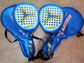 Se venden dos raquetas de pádel de la marca Masspro, ambas con su funda. Presentan claras señales de desgaste por uso. Fundas en muy buen estado. - Modelo: R20 PLUS - Material: Carbono y Kevlar - Color: Azul con detalles en amarillo y negro - Incluye dos fundas azules a juego