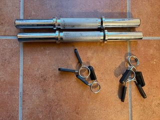 Set de mancuernas cromadas con agarre texturizado y dos pares de cierres de pinza mas discos de peso. Ideal para entrenos de fuerza y rehabilitación. - 3 barras de mancuerna. - 6 cierres de pinza negros. - 16 pesas de 1kg - 6 de 2kg NO SE HACEN ENVIOS.