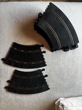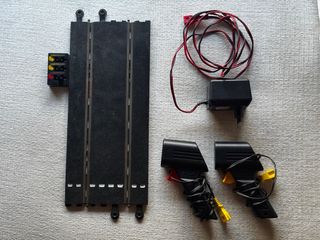 Set de Scalextric con pista, dos mandos y transformador. - 14 curvas - 4 rectas pequeñas - 2 rectas cruzadas - 3 rectas - 12 pianos, 11 curvas y 1 recto. - 8 quitamiedos