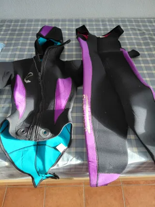 Traje de neopreno para mujer con detalles en morado y negro. - Diseño con capucha integrada. - Cremallera frontal para facilitar su uso. - Paneles de color morado en zonas estratégicas. - Interior en color azul turquesa.