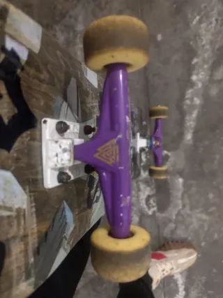 Skate completo con ejes morados y ruedas amarillas. - Ejes de color morado. - Ruedas de color amarillo. - Diseño de skate.