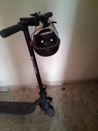 Patinete eléctrico en color negro, ideal para desplazamientos urbanos. Incluye casco. - Diseño moderno y funcional. - Manillar ajustable. - Ruedas con detalles en rojo. Funciona todo perfectamente ..