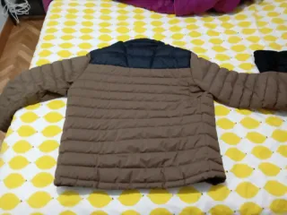 Abrigo acolchado de dos tonos, ideal para actividades al aire libre. - Color marrón y negro. - Cierre de cremallera. - Cuello alto.
