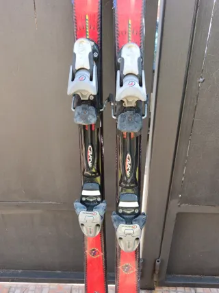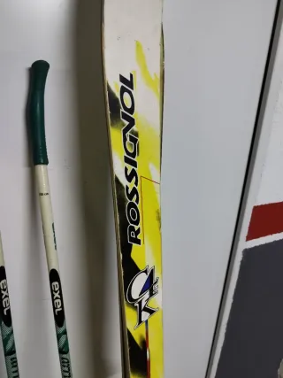 Esquís Rossignol de 165 cm, color amarillo, con fijaciones Salomon (modelo 575) y bastones Exel de 150 cm incluidos. Estado: muy usados (los encontré en la calle), no los he probado personalmente. Se venden tal como están. Se pueden vender los bastones por separado.