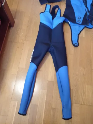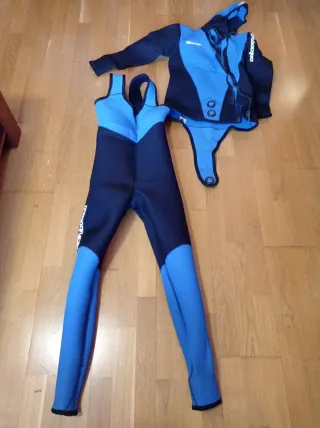 Conjunto de traje de buceo de dos piezas en azul y negro. - Nuevo, sin usar. - Parte superior tipo chaqueta con cremallera frontal. - Parte inferior tipo peto con tirantes. - Material de neopreno de 5mm - Fabricado en España.