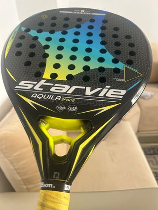 Pala de pádel Starvie Aquila Space con un diseño llamativo en negro, amarillo y azul. - Superficie con agujeros. - Marco con detalles en amarillo. - Grip amarillo.