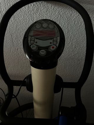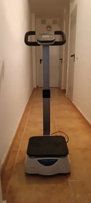 Plataforma vibratoria Merit Fitness V1000. - Color blanco y negro. - Diseño vertical con manillar. - Incluye asas de sujeción.