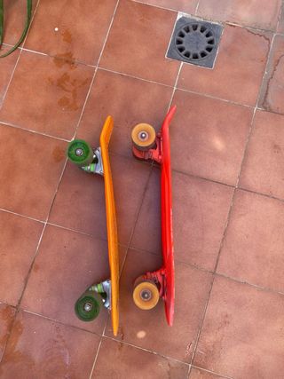 Se venden dos patinetes tipo Penny Board, uno de color naranja y otro rojo. Ideales para desplazamientos cortos y diversión. - Patinete naranja. - Patinete rojo. - Ruedas verdes y amarillas.