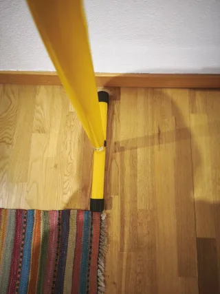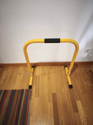 Barra paralela de color amarillo, ideal para calistenia y entrenamiento en casa. - Estructura metálica resistente. - Empuñaduras acolchadas para mayor comodidad. - Base estable con protectores de suelo.