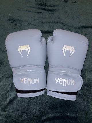 Par de guantes de boxeo Venum en color gris. - Peso: 10 oz. - Marca: Venum. - Diseño con logo de serpiente. - Cierre de velcro. - Inscripción ADRENALINE INSIDE.