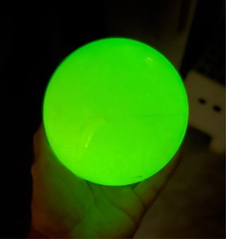 Bola de contacto que emite luz en la oscuridad. - Color verde brillante. - Material translúcido. - Tiene alguna marca del tiempo