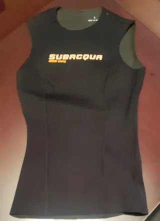 Chaleco térmico SUBAQUA para mujer, talla 1. Diseñado para buceo o deportes acuáticos. Marca: Subacqua. Material: Neopreno. Uso principal: Aislamiento térmico y protección para deportes acuáticos como buceo o natación en aguas abiertas. Características: Diseño sin mangas. Grosor 2,5 mm. Un solo uso, está en perfectas condiciones.
