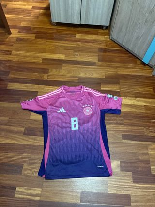 Segunda equipación de la selección alemana de fútbol, talla M. - Color rosa degradado a azul marino. - Número 8 en blanco en el frontal. - Escudo de Alemania y logo de Adidas. - Tecnología Aeroready.
