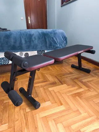 Se vende kit de gimnasio completo para entrenar en casa. Incluye banco, kit de pesas y esterilla. El banco prácticamente nuevo, las pesas y las esterillas nuevas - Banco de entrenamiento ajustable. Se ha usado 5 veces. - Kit de pesas de 20 kg. 8 discos de 1 kg y 4 discos de 2 kg. 2 mangos. Completamente nuevo - 2 Esterilla enrollable para ejercicios. Nuevas