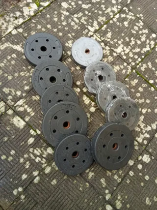Banco de pesas con barra y discos para entrenar en casa. Estructura robusta y acolchado cómodo. - Barra incluida. - Discos de pesas de diferentes tamaños. - Banco acolchado con acabado en rojo y negro. Son 2 Discos de 10kg y 2 de 5 kg ( Las marcas son porque durante x tiempo los discos se han dejado alla)