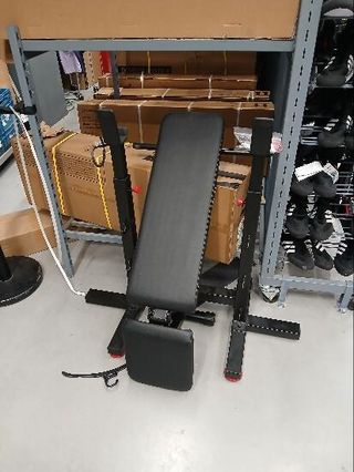 SOLO BANCO Banco de pesas reclinable Klar Fit con soportes para barra. Con señales de uso, pero totalmente funcional.