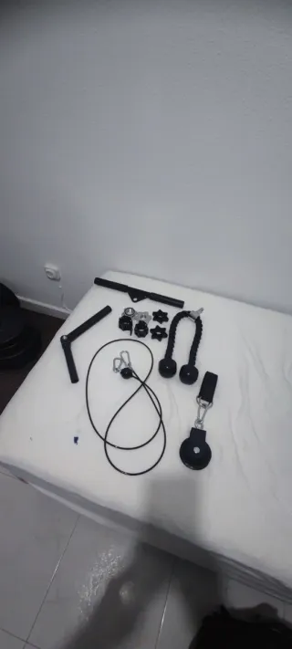 Conjunto de equipamiento para entrenamiento en casa valorado en 327 € No se vende por deparado - Barra Z cromada. - 2 barras de mancuerna - 6 cierres anti caída de pinza - 2 discos de 10 kl - 4 discos de 5 kl - 8 discos de 2 kl - 6 discos de 1 kl