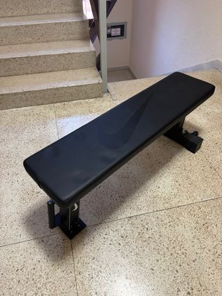 Banco de pesas para entrenamiento de fuerza. - Dimensione: 106f x 30an. x 46al. cm - Altura 46 cm. - 107 cm - Diseño plano y compacto. - Estructura metálica resistente. - Tapicería negra con logo. Se vende por falta de uso. Se ha usado en dos ocasiones.