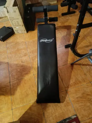 Banco de entrenamiento Physionics en color negro. - Diseño acolchado para mayor comodidad. - Estructura robusta. - Logo de la marca visible.banco de musculación sin pesas no entra el saco de boxeo que está encima