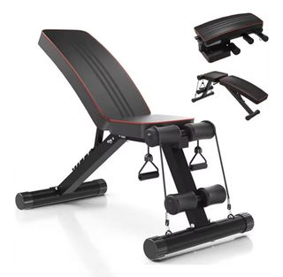 Banco de musculación plegable con detalles en rojo. - Tapicería negra con ribetes rojos. - Estructura metálica. - Bandas elásticas incluidas.