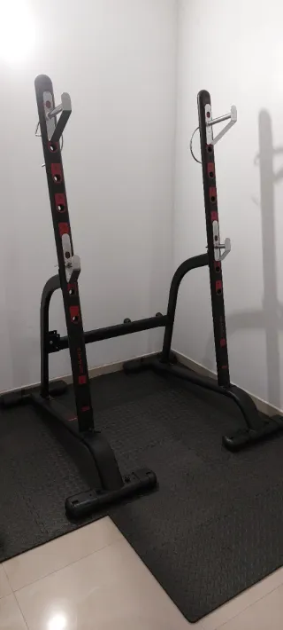 Rack de entrenamiento Domyos RBR910. Estructura metálica resistente. Barras de seguridad ajustables. Soportes para barras. Perfecta para sentadilla y press banca. Está como nueva con señales de uso, estructura regulable tanto altura de los soportes como la anchura de la misma. Ideal para principiantes y para tu gimnasio en casa. Es muy robusta y permite una carga máxima de 250 kg. Se puede plegar y desplegar para que ocupe menos espacio en casa. Especificaciones: Largo: 120 centímetros, Ancho: 165 centímetros, Alto: 185 centímetros. Capacidad de carga de peso: 250 kilogramos.