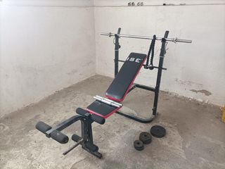 Banco de musculación Domyos BM 120 con barra, discos, polea y mancuernas Vendo banco de musculación Domyos BM 120 en muy buen estado. Incluye todo lo necesario para montar un gimnasio completo en casa. Incluye: • Banco reclinable Domyos BM 120 • 1 barra larga para press • 4 discos de 10 kg • 4 discos de 2,5 kg • 4 discos de 2 kg • 2 barras cortas tipo mancuerna para usar los discos al gusto • 1 polea para tríceps Equipo muy versátil para entrenar pecho, brazos, espalda y hombros. Ideal para casa. Solo venta por falta de uso.