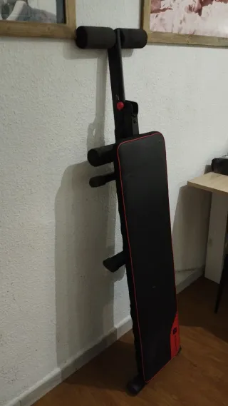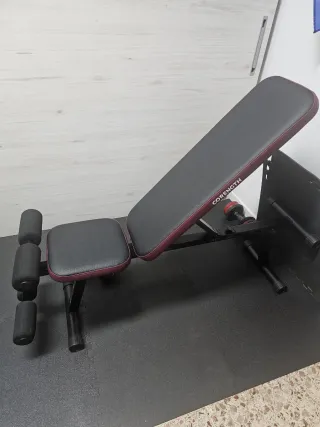 Banco de pesas y abdominales de la marca CORENGTH inclinable y plegable. Ideal para entrenamientos en casa. - Tapicería acolchada en negro con ribete burdeos. - Estructura metálica robusta. - Soporte para piernas. - Diseño ajustable para diferentes ejercicios.Con caja de origen