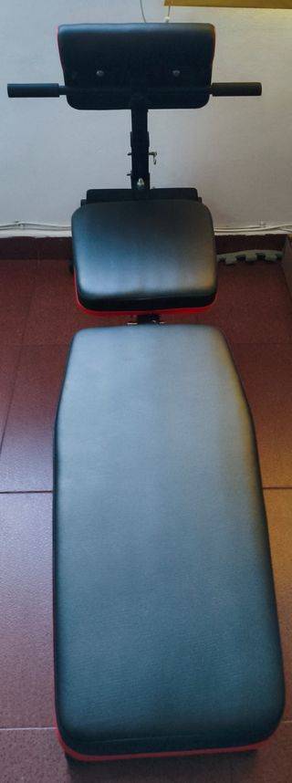 Banco de pesas y abdominales con acolchado negro y rojo. - Tanto inclinable como declinable, para poder trabajar pecho superior e inferior, tiene muchas posiciones intercaladas. - Diseño moderno. - Estructura metálica. - Acolchado cómodo.