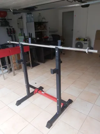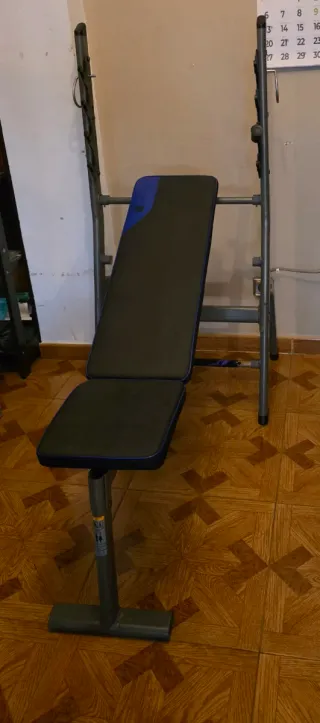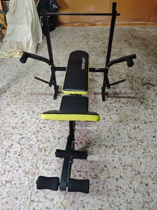 Está como nuevo, El equipo no tiene ni marcas claras de uso. Viene con La barra, dos discos de 20Kg cada uno con 4 abrazaderas puestas dos a cada lado. También incluye una almohadilla de protección para la barra al hacer sentadillas. El banco tiene dos posturas, recto e inclinado Banco de musculación con rack ultra compacto, estable y robusto. Peso máximo de 100 kg en rack con barra y 100 kg en el banco. Barra compatible de 1,55 a 2 m de longitud . Soportes ajustables. Los soportes de barra integrados te permiten trabajar con barra de forma segura, están muy cerca por lo que siempre permanecen en tu campo de visión.