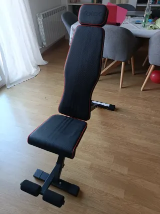 Banco de pesas ajustable con diseño ergonómico y acolchado. - Respaldo y asiento acolchados. - Estructura metálica resistente. - Ruedas para ajuste de piernas. - Plegable