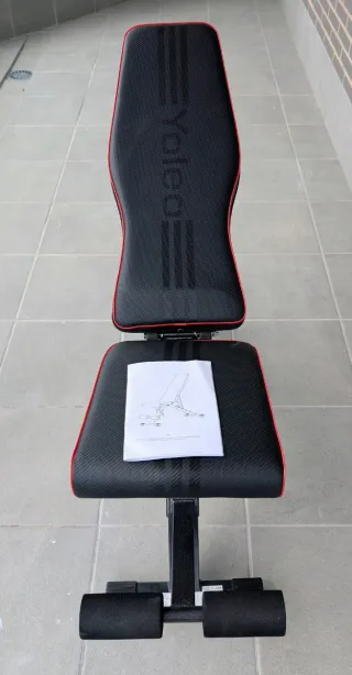 Banco de pesas Yoleo en excelente estado, como nuevo y plegable. - Diseño moderno con detalles en rojo. - Tapicería negra con textura. - Estructura robusta y estable. Se vende por falta de uso.