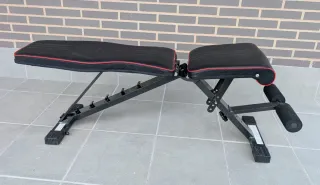 Banco de pesas con diseño moderno y acolchado para mayor comodidad. - Estructura metálica robusta. - Tapicería negra con ribete rojo. - Acolchado en pies y respaldo. Lo compré pero sólo lo he usado un dia 30m😅 No es plegable. Todo junto 95€ sin las pesas 75€. POR SU DIMENSIÓN NO HAGO ENVÍO, RECOGIDA EN MANO