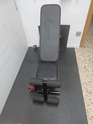 Equipo de gimnasio para entrenar en casa. - Banco de pesas ajustable y plegable. - Juego de mancuernas y discos: dos de 10kg,dos de 4 kg,dos de 3kg y dos de 1 kg.