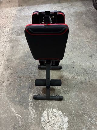 Banco de deporte para entrenamiento CORENGT. - Tapicería negra con ribete rojo. - Estructura robusta. Banco de musculación con diferentes posiciones: posición abdominales, diferentes inclinaciones y de respaldo y de asiento. Plegable para guardar. Para más especificaciones como las medidas en la web de Decathlon se encuentran. No se ha usado, pero no hay caja ni etiquetas.