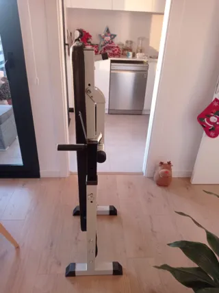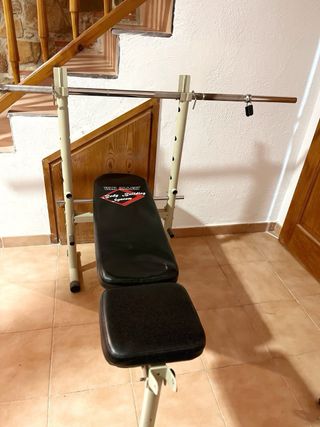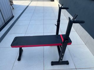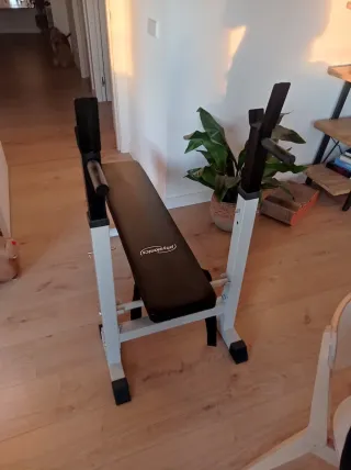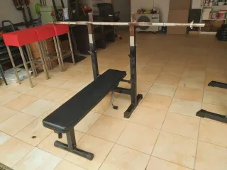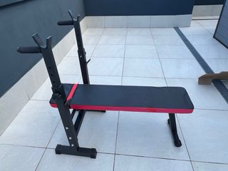 Banco de musculación con soportes para pesas. - Estructura metálica resistente. - Banco acolchado. - Soportes ajustables en altura. - Estructura plegable Dimensiones extendido: Alto: 100cmm Ancho: 58cm Altura banco: 45cm Anchura banco 27cm Profundidad banco 108cm Dimensiones plegado: Altura : 127cm Anchura: 58 cm Profundidad: 40cm Peso : 12kg Estado : como nuevo